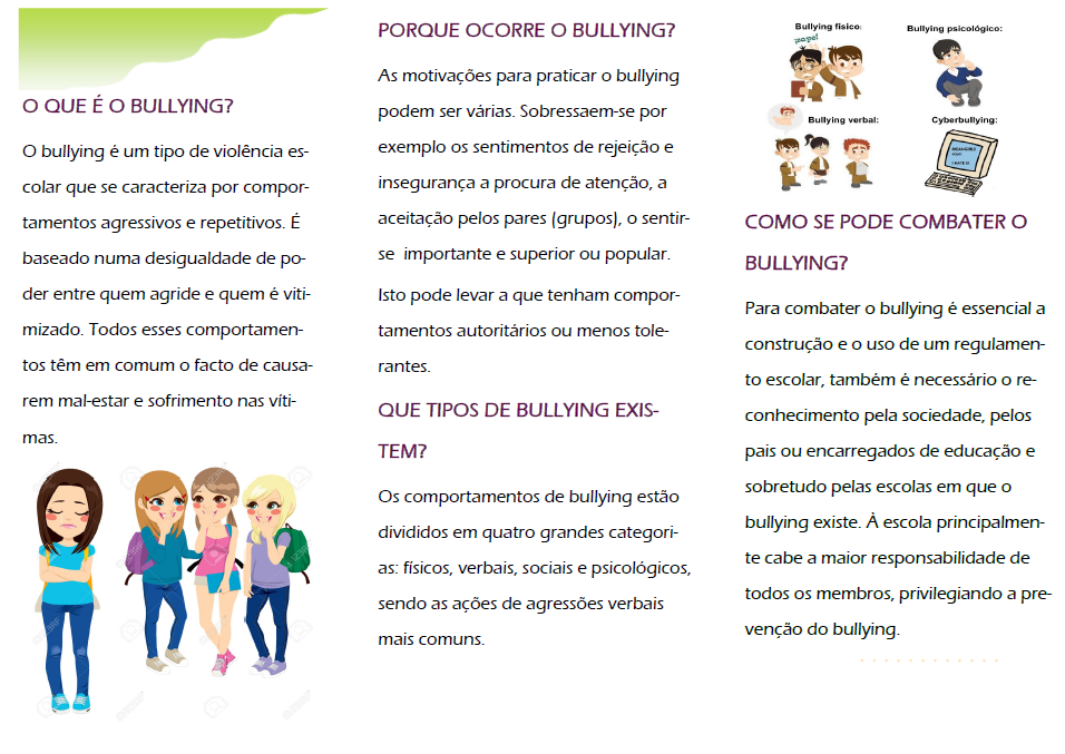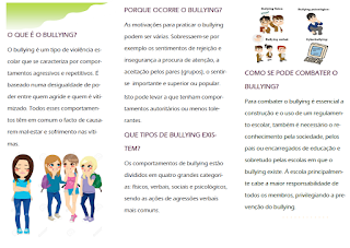 Os alunos da turma 6º G foram desafiados a fazer, na aula de Formação Cívica, um projeto...a realização de um folheto que explicasse aos jovens o que se entende por Bullying.