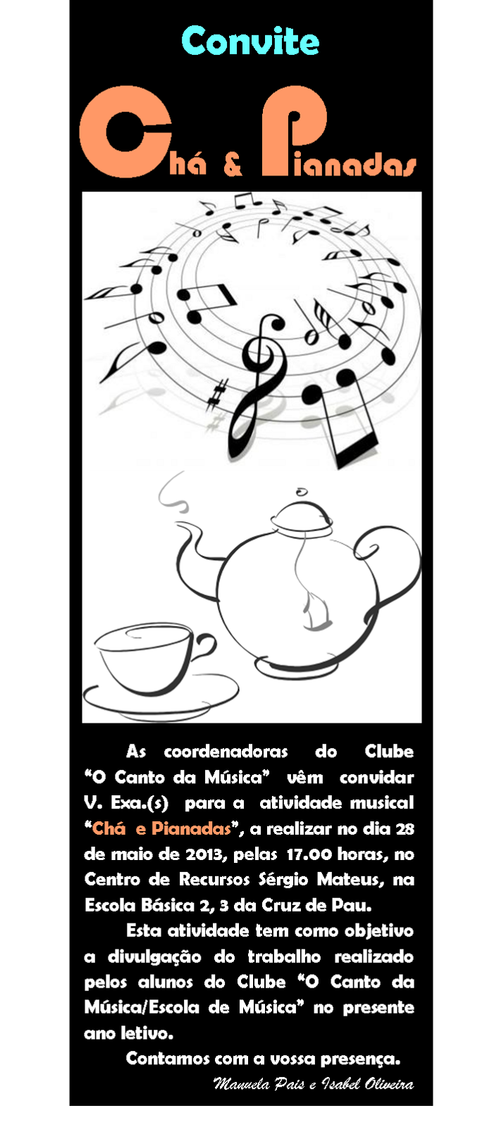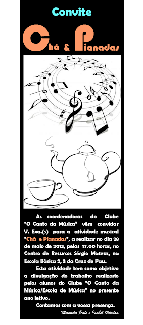 No dia 28 de maio irá decorre na Biblioteca a atividade - Chá e Pianadas, no ambito do trabalho desenvolvido no Clube da Música-"O canto da Música", da responsabilidade do grupo de Educação Musical. Esta será apoiada pela equipa CR e irá contar, para além dos professores e alunos envolvidos, com a presença dos respetivos encarregados de educação e de outros convidados.